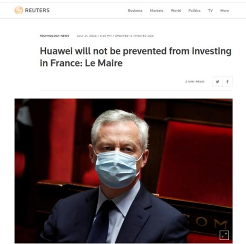 英國(guó)上周宣布將禁用華為后,其他歐洲國(guó)家對(duì)待華為的態(tài)度也受到關(guān)注。路透社21日最新消息說,法國(guó)財(cái)政部長(zhǎng)勒梅爾當(dāng)天表示,法國(guó)不會(huì)禁止華為在法投資5G。