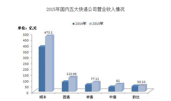 從包裹的來看的話,2016年中通、申通、圓通、韻達(dá)、EMS和順豐的市場(chǎng)份額分別為14.3%、12.4%、14.7%、10.5%、6.2%和8.2%。在營(yíng)收方面,韻達(dá)2015年?duì)I收為50.53億元,圓通同期營(yíng)收分別為120.96億元,順豐同期營(yíng)收分別為473.1億元,申通同期營(yíng)收分別為77.11億元。中通營(yíng)收約61億元。