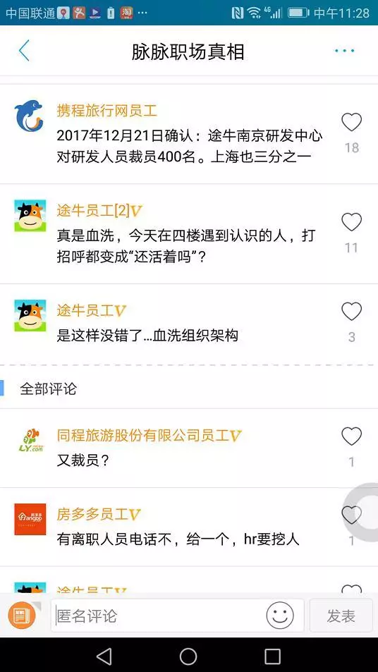 一位與途牛有合作的業(yè)內(nèi)人士表示,途牛僅機(jī)票業(yè)務(wù)部門(mén)就有兩百到三百的技術(shù)研發(fā)人員,因此,對(duì)于途牛這樣規(guī)模的公司,裁員400人屬于正常范圍,每家公司一年都要有10%-20%的自然裁員。