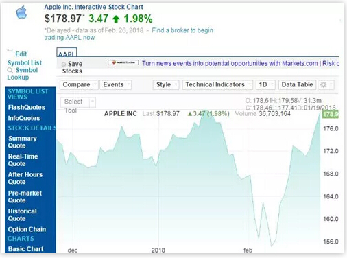 由于億萬富翁沃倫·巴菲特高談闊論他旗下公司所持蘋果公司股票,周一美國股市收盤時(shí),蘋果股票價(jià)格為178.97美元,較前一交易日175.5美元的收盤價(jià)上漲3.47美元,漲幅為1.98%。