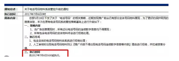 而創(chuàng)意中不得出現(xiàn)近似電話號碼的連續(xù)數(shù)字,則是從今日(5月19日)23:00起執(zhí)行,大家提前修改好創(chuàng)意,避免創(chuàng)意不能生效,從而導(dǎo)致流量異常的尷尬。