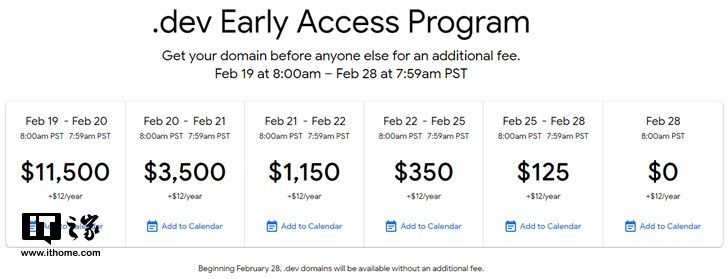2月19日,谷歌開(kāi)放公眾早期訪(fǎng)問(wèn)階段,允許普通用戶(hù)進(jìn)行注冊(cè)。自美國(guó)時(shí)間2月19日8:00到2月28日7:59期間內(nèi)注冊(cè).dev頂級(jí)域名,需要向谷歌繳納不等的費(fèi)用,美國(guó)時(shí)間2月28日之后,將免費(fèi)開(kāi)放注冊(cè)。
